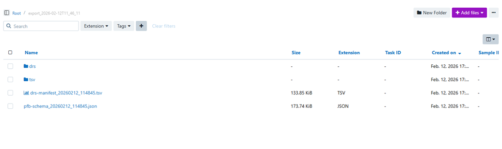 | drs/ | A folder containing successfully resolved files downloaded using valid DRS URIs. | Provides the actual file content referenced in the PFB so users can directly work with the underlying data, not just metadata. |