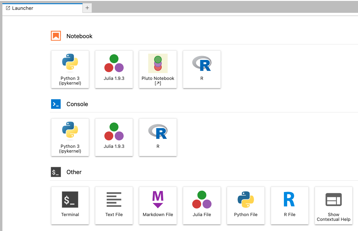 When you open JupyterLab, you see the Launcher screen that allows you to select one of the available options: